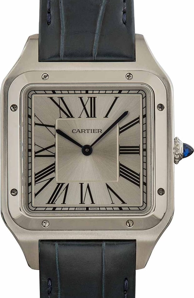 Pre-owned Cartier Santos Dumont ref WSSA0032 “Extra Large” model is bold, fashion-forward, and contemporary. At the same time, it holds fast to the enduring design codes that have defined the collection for over a century, including the timeless square-shaped case, screw bezel, Roman numeral dial, and crown decorated with a striking blue cabochon. The sunray silver dial radiates outward from the iconic blued sword-shaped hands and flawlessly matches the stainless steel case. This dial variation embraces a more modern aesthetic than other silver Cartier watch faces. What’s also fascinating about this pre-owned Cartier are its dimensions. It takes a bold stance on the wrist at 46.6mm x 33.9mm yet features a relatively slim profile of just over 7mm because it sports a sleek hand-wound movement. A true horological masterpiece.
